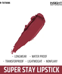 “Insight Cosmetics Super Stay Lipstick is infused with Moroccan argan and vitamin E oil. This transfer proof lipstick has the ultimate power to nourish your lips. It features a two-in-one formula that combines intense pigments with a non transferable formula that locks in color and provides a comfortable wear all day without any dryness. It has a creamy texture that delivers a smooth and soft matte finish.